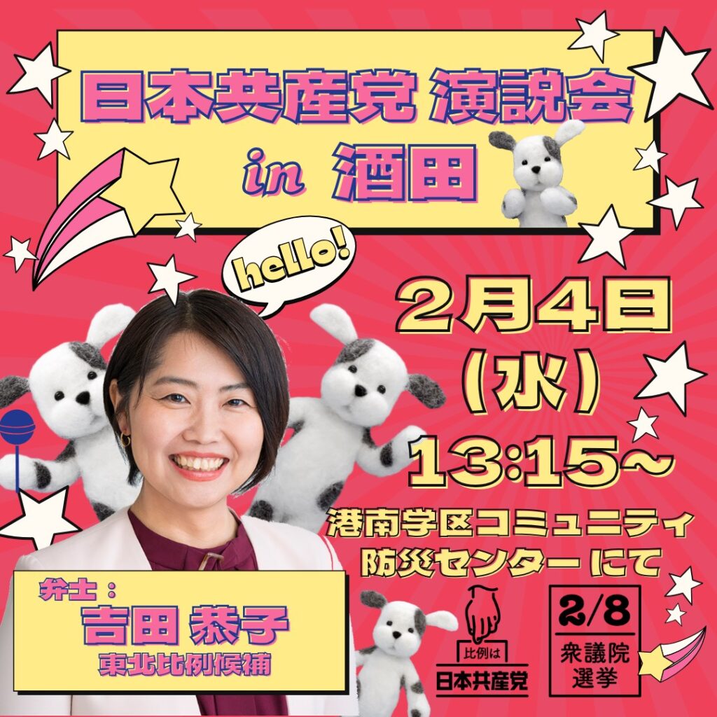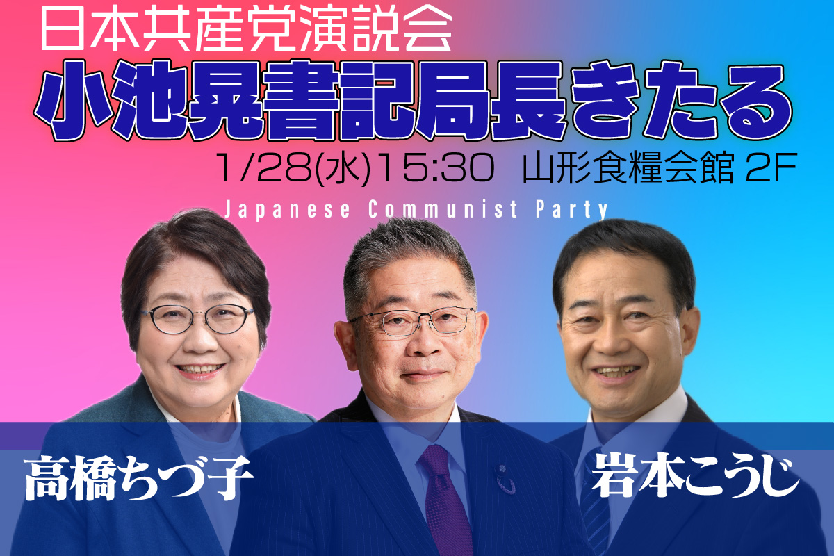 - 2026.1.28日本共産党演説会LIVE配信のお知らせ2026年1月28日15:30より山形県食糧会館での演説会をユーチューブでライブ配信いたします。ぜひ多数のご来場とご視聴をお待ちしております。