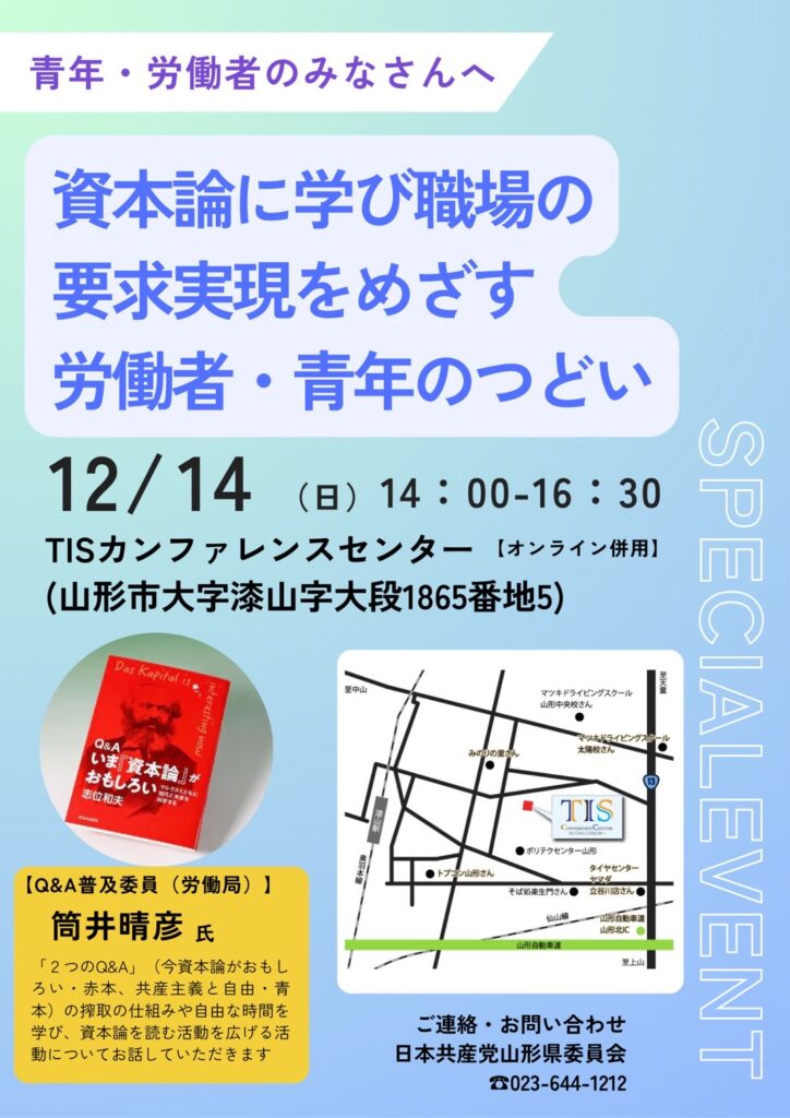 12月14日(日)「『資本論』に学び職場の要求実現をめざす労働者・青年のつどい」を山形市で開催します